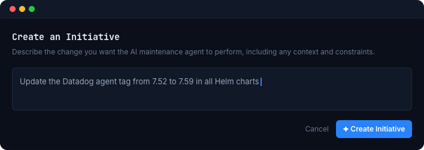 Integrate with your Git provider and Maintenance Agent automatically imports your repositories. You're ready to start your first initiative in minutes.