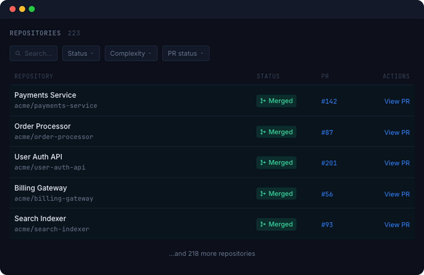When you're satisfied, Maintenance Agent creates pull requests across all targeted repositories. PRs include clear descriptions, pass CI, and are ready for your team to review and merge.